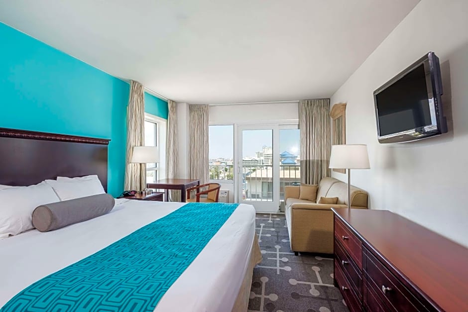 This room has a partial view of the ocean, one king bed and sofa bed, a balcony, microwave and refrigerator.